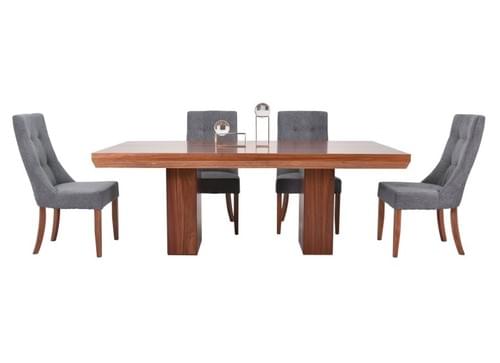 Lujoso comedor enchapado en madera de Tzalam, con 6 sillas tapizadas en tela oxford.