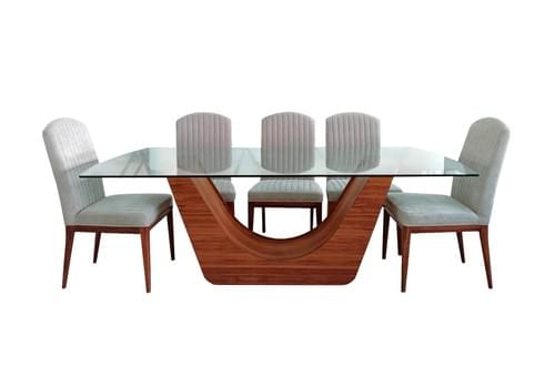 Elegante comedor con pedestal enchapado de walnut uv, cristal templado, 8 sillas en tela beige.